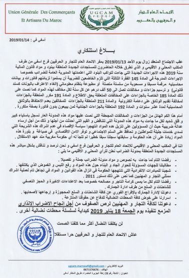 بعد رفضه نصوص ومواد مدونة الضرائب ، دعا الإتحاد العام للتجار والحرفيين الفرع المحلي والإقليمي لآسفي ، الى إضراب إنذاري يوم الجمعة 18 يناير 2019 .