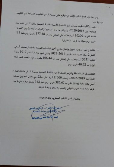 وأكد الفهري أن الوزارة بصدد التوقيع على اتفاقية لتأهيل الأحياء الناقصة التجهيز بمدينة آسفي، خلال الفترة الممتدة بين 2019-2022 وتهمان 11000 أسرة تقطن ب 22 حي ناقص التجهيز بمدينة آسفي بتكلفة مالية إجمالية تقدر ب 387.67 مليون درهم منها 142 مليون درهم ممولة من طرف وزارة التراب الوطني والتعمير والإسكان وسياسة المدينة.
