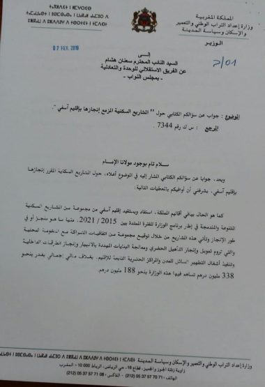 في جواب له على سؤال كتابي للبرلماني هشام سعنان  حول وضعية الأحياء الناقصة التحهيز ، وعد عبد الأحد الفاسي الفهري وزير إعداد التراب الوطني والتعمير والإسكان وسياسة المدينة، بحل إشكالية 22 حي ناقصة التجهيز بآسفي.