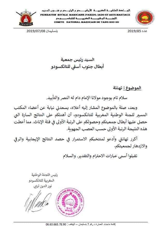 و بهذا الإنجاز الكبير قدمت اللجنة الوطنية المغربية للتانكسودو تهنئة خاصة للمدرب ورئيس جمعية أبطال جنوب آسفي للتانكسودو ” عبد الرحيم الصواب ” عرفانا بالمجهودات التي يبذلها والتي أثمرت عن التتويج بالمرتبة الأولى في البطولة الوطنية الرابعة للتانكسودو بتطوان لموسم 2018/2019 فئة الإناث.
