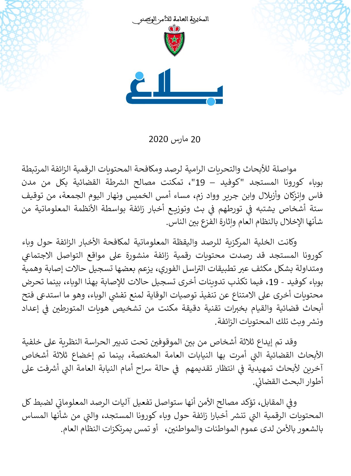 أعلنت المديرية العامة للأمن الوطني في بلاغ أصدرته اليوم الجمعة 20 مارس 2020 ، عن إيداع ثلاثة أشخاص تحت الحراسة النظرية، وتقديم ثلاثة آخرين في حالة سراح أمام النيابات العامة، لتورطهم في نشر وبث محتويات رقمية زائفة بواسطة أنظمة المعلوميات في قضايا لها علاقة بفيروس كورونا .