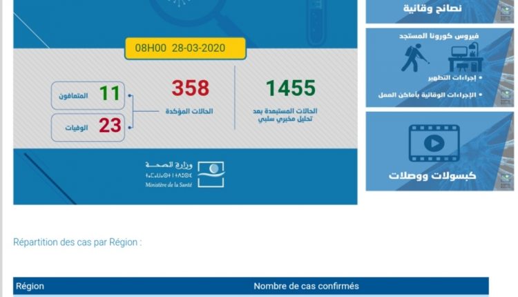 أعلنت وزارة الصحة عبر بوابتها الاكترونية عن تسجيل 13 حالة جديدة مؤكدة الإصابة بفيروس #كورونا المستجد، ليرتفع العدد الإجمالي إلى حدود الساعة العاشرة من صباح اليوم السبت 28 مارس 2020 إلى 358 حالة.