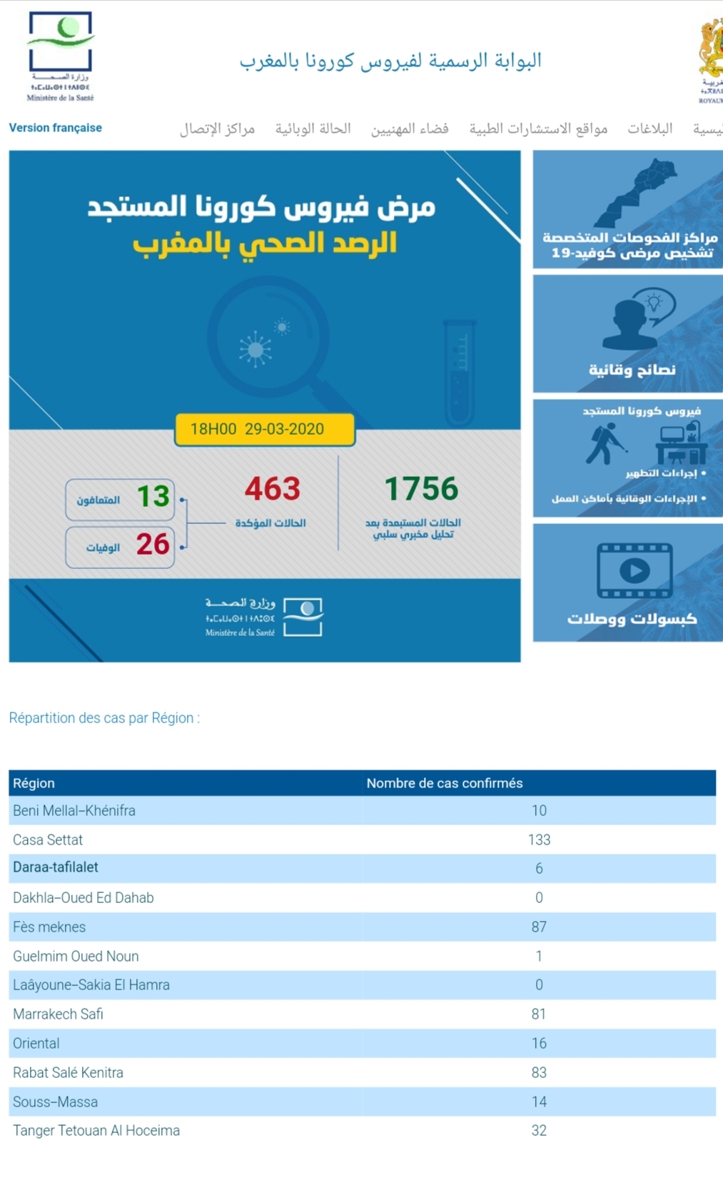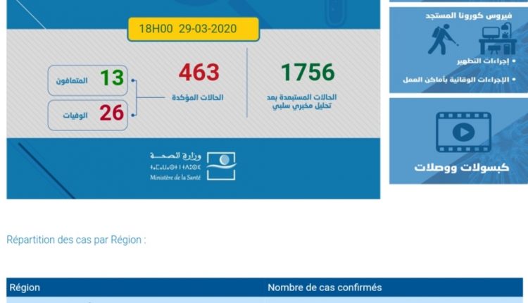 إلى حدود الساعة السادسة مساء من يوم الأحد 29 مارس 2020، عرفت الحالة الوبائية بـفيروس #كورونا # تسجيل 104 حالة جديدة مؤكدة الإصابة والحصيلة ترتفع إلى 463 حالة.
