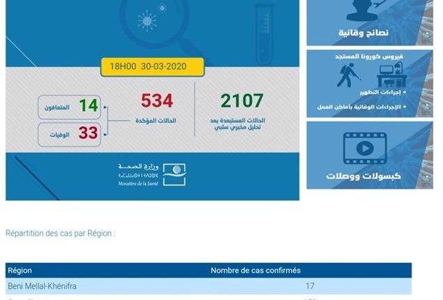 إلى حدود الساعة السادسة مساء من الاثنين 30 مارس 2020، عرفت الحالة الوبائية بـفيروس #كورونا # تسجيل 534 حالة جديدة مؤكدة الإصابة .
