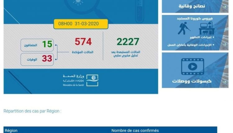 صحـــةمنوعات جديد “كورونا” الحصيلة ترتفع الى 574 وعدد الإصابات بجهة مراكش أسفي يرتفع الى104 بواسطة safisud.com في مارس 31, 2020 1 1 شارك FacebookTwitterGoogle+ReddItWhatsAppPinterestالبريد الإلكتروني