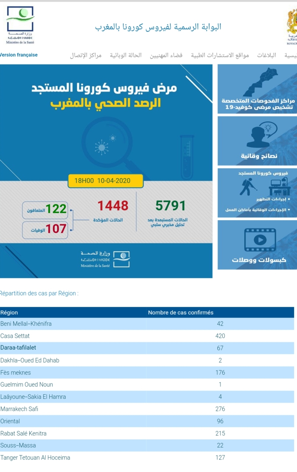 أعلنت وزارة الصحة مساء اليوم الجمعة 10 ابريل 2020 عن إرتفاع حصيلة المصابين بكوفيد 19 الى 1448 حالة مؤكدة ، فيما وصل عدد حالات الوفات الى 107 وعدد المتعافين الى 122 حالة شفاء .