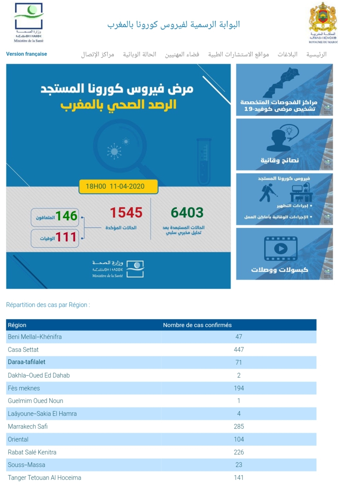 أعلنت وزارة الصحة مساء اليوم السبت 11 أبريل 2020 عن إرتفاع حصيلة المصابين بكوفيد 19 الى 1545حالة مؤكدة ، فيما ارتفع عدد الوفيات الى 111 وعددالمتعافين الى 146حالة شفاء .