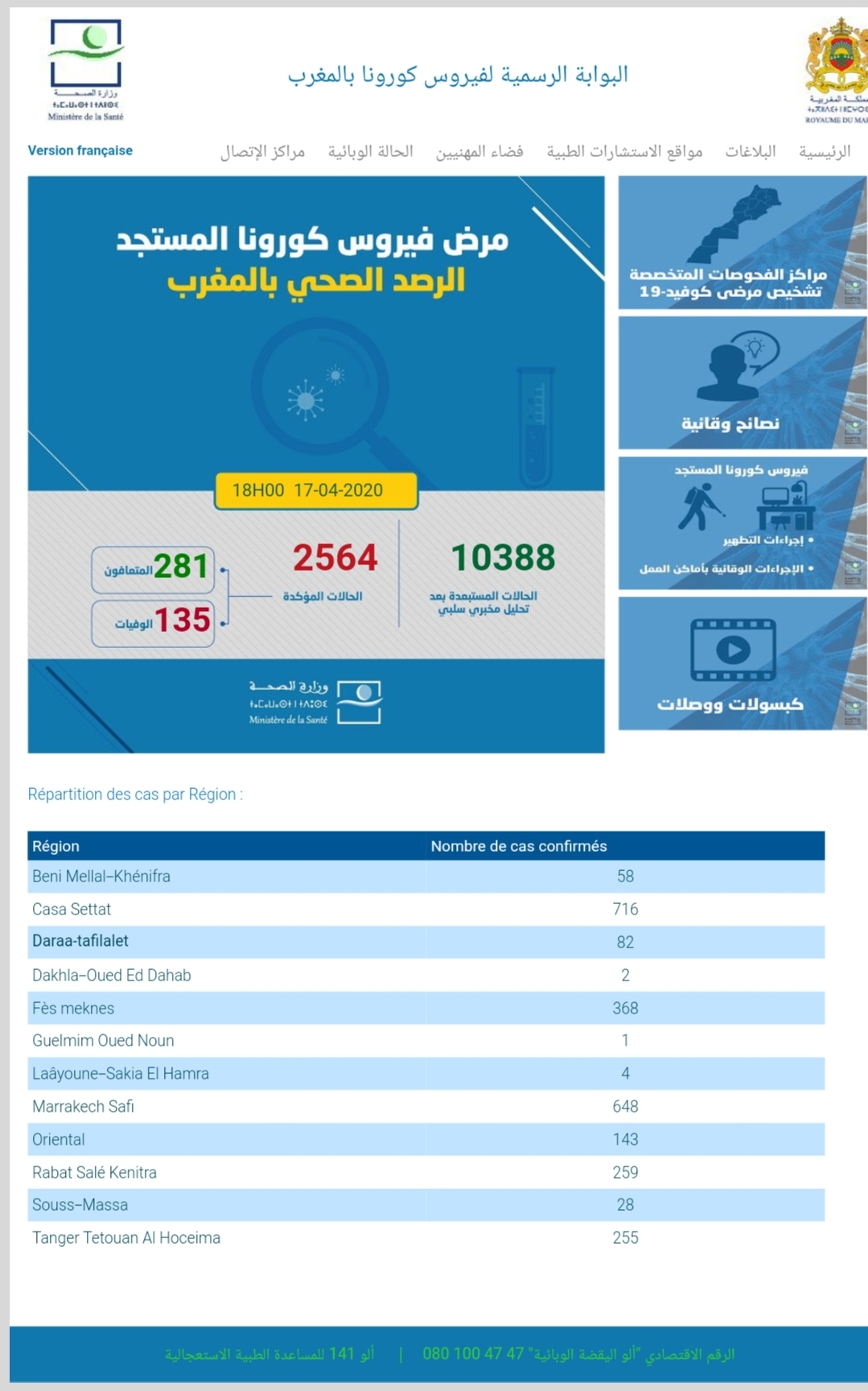أعلنت وزارة الصحة عن تسجيل 281 حالة إصابة جديدة بكوفيد 19 خلال 24 ساعة الماضية لترتفع الحصيلة الى 2564 حالة مؤكدة .