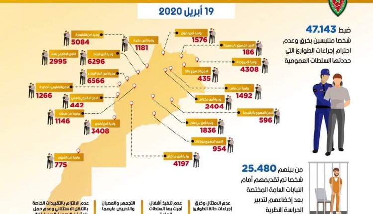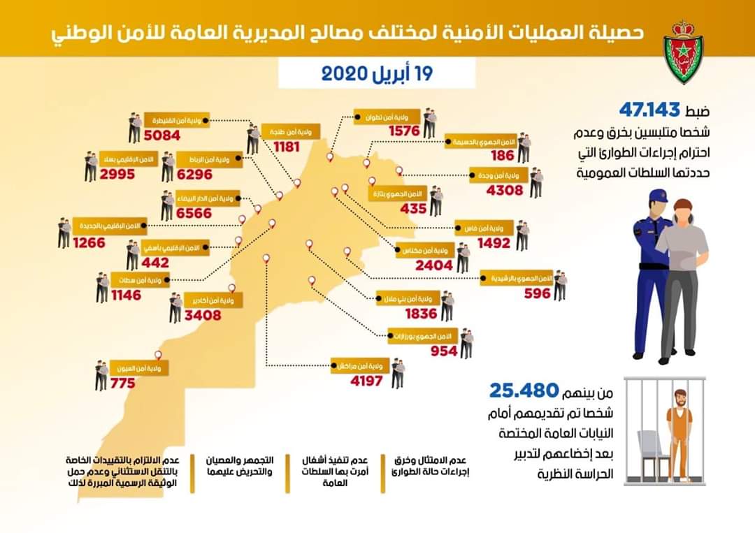 كشف رسم بياني للمديرية العامة للأمن الوطني ، ان عدد الموقوفين بسبب خرق حالة الطوارئ الصحية بآسفي وصل الى 442.