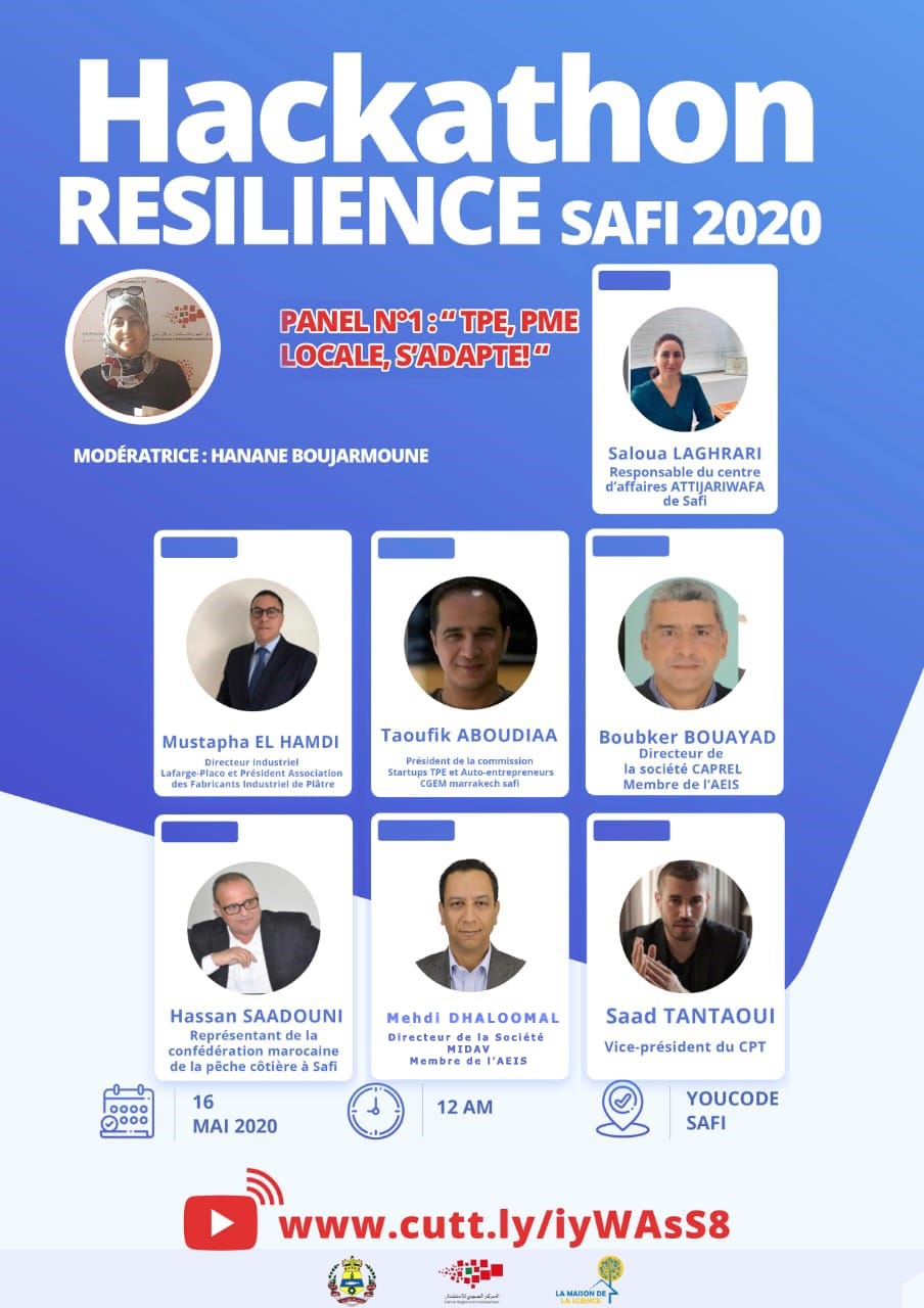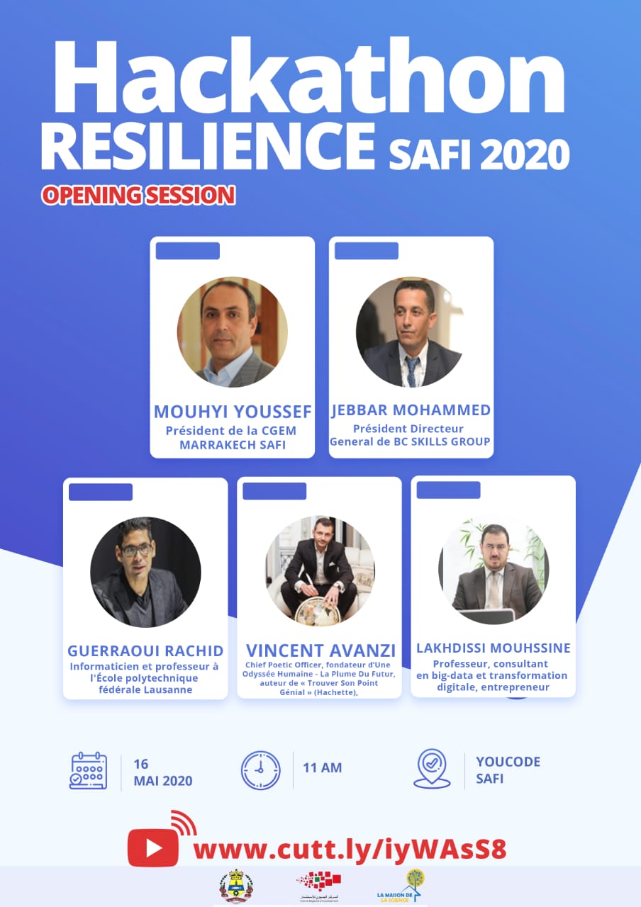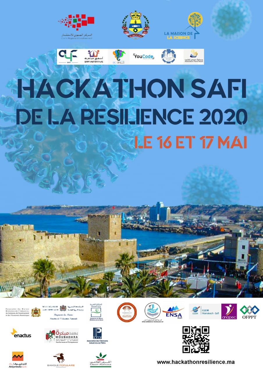 في إطار المبادرات التطوعية والمواطنة، الواعية بتداعيات الأزمة الصحية الراهنة على النسيج الاقتصادي الوطني بصفة عامة و المحلي بصفة خاصة، تقوم عمالة آسفي و المركز الجهوي للاستثمار مراكش- آسفي، بتعاون مع دار العلوم بأسفي، مبادرة Act4Comminuty، معهد Youcode،آسفي مبادرة، حوض آسفي، جمعية الصناع وأرباب المعامل بأسفي، مجموعةBC SKILLS ، اتحاد مقاولات المغرب بمراكش- آسفي و كذلك عدد من الشركاء المؤسساتيين والخواص، بتنظيم مسابقة التحدي الافتراضية آسفي 2020 تحت شعار: ” آسفي في مواجهة الأزمة : أي مستقبل ؟”، وذلك يومي 16 و 17 ماي 2020.