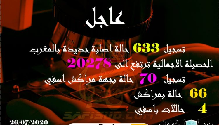 وبخصوص الحالة الوبائية بجهة مراكش اسفي فقد سجلت الجهة 70 حالة جديدة ، 66 بجهة مراكش اسفي و 4 حالات بمدينة اسفي ، وذلك الى حدود الساعة السادسة من مساء اليوم الاحد 26 يوليو 2020 .