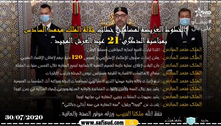 جهويا ووطنيامنوعات الخطوط العريضة لمضامين خطاب جلالة الملك بمناسبة الذكرى 21 لعيد العرش المجيد بواسطة safisud.com آخر تحديث يوليو 31, 2020 0 0 شارك FacebookTwitterGoogle+ReddItWhatsAppPinterestالبريد الإلكتروني