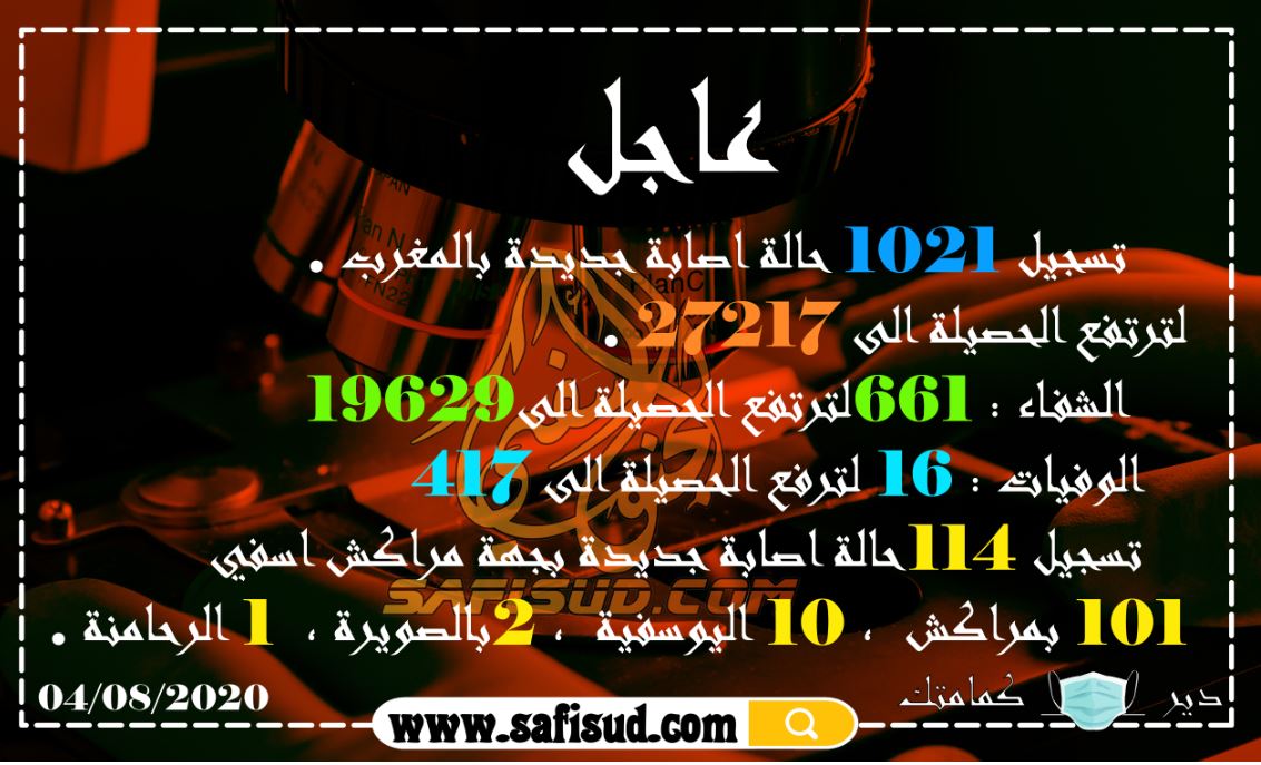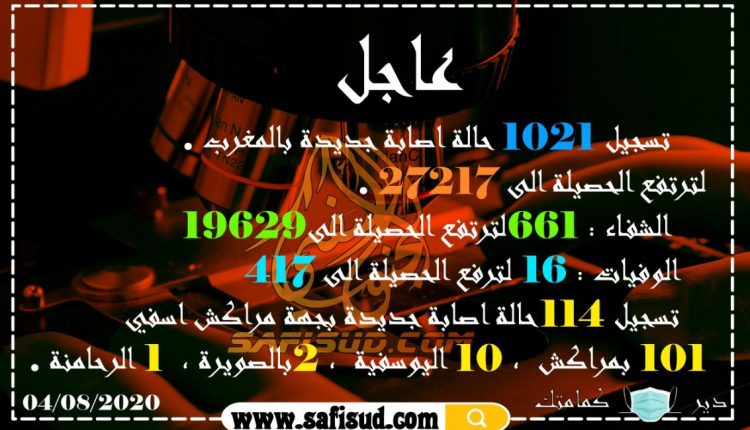 صحـــةمنوعات الحالة الوبائية : تسجيل 1021 حالة جديدة بالمغرب والحصيلة ترتفع الى 27217 وجهة مراكش اسفي تسجل 114 بواسطة safisud.com آخر تحديث أغسطس 4, 2020 1 1 شارك FacebookTwitterGoogle+ReddItWhatsAppPinterestالبريد الإلكتروني