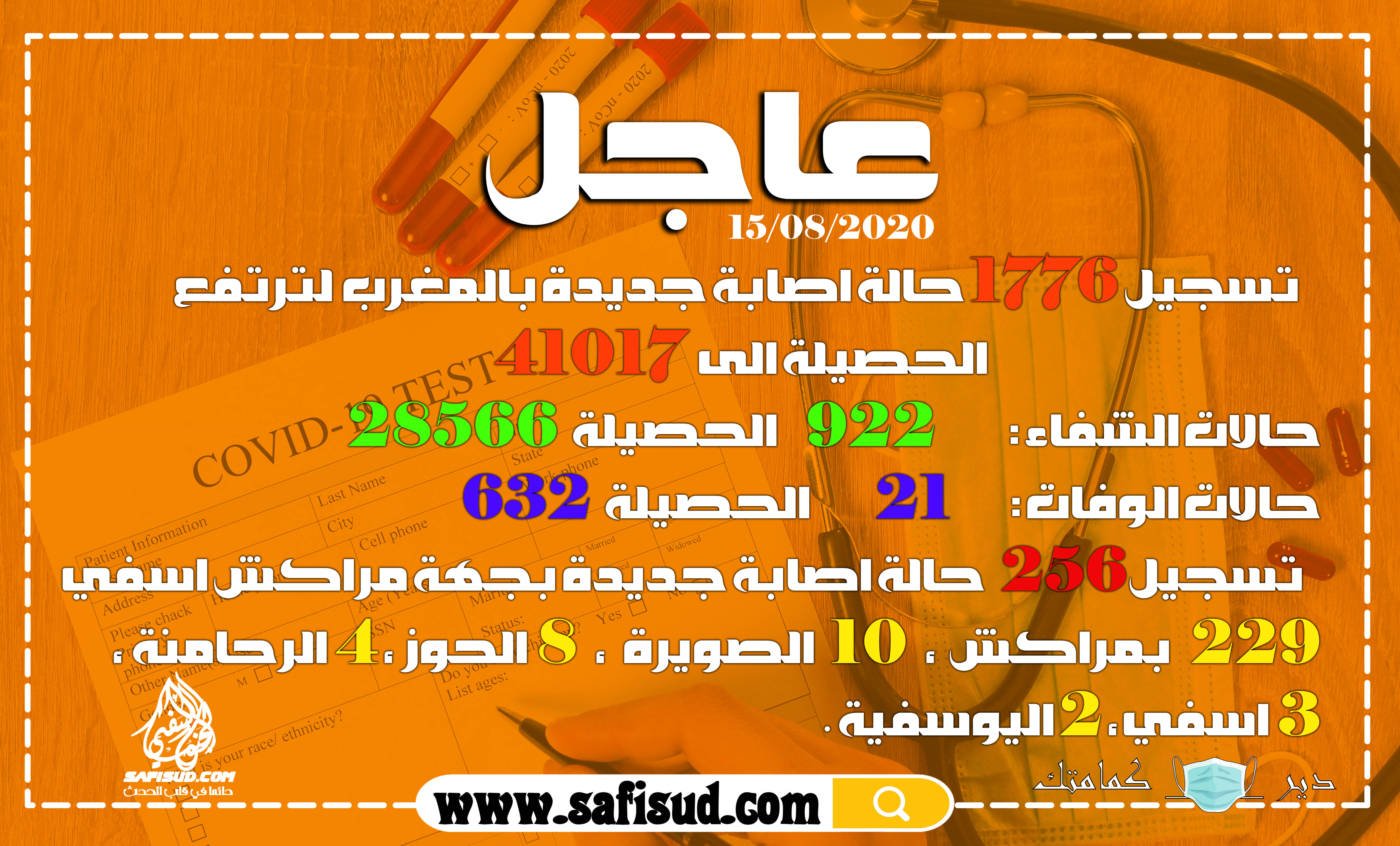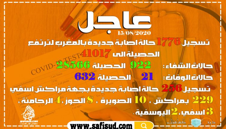 صحـــةمنوعات تسجيل 1776 حالة جديدة بالمغرب والحصيلة ترتفع الى 41017 ،جهة مراكش آسفي تسجل 256 حالة ، 229 بمراكش و3 حالات باسفي بواسطة safisud.com في أغسطس 15, 2020 0 0 شارك FacebookTwitterGoogle+ReddItWhatsAppPinterestالبريد الإلكتروني