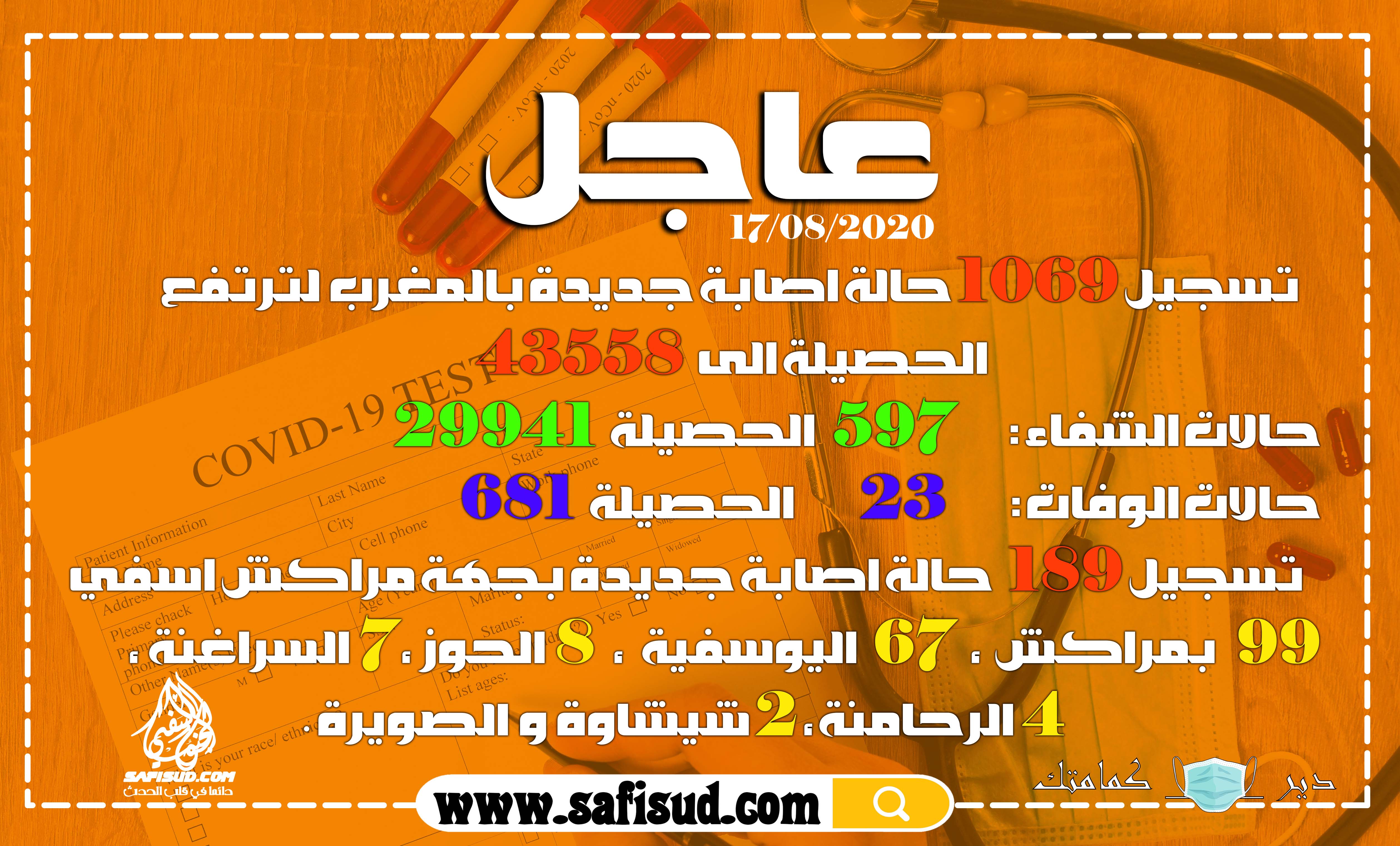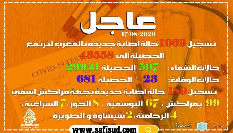 صحـــةمنوعات تسجيل 1069حالة جديدة بالمغرب والحصيلة ترتفع الى 43558 ،جهة مراكش آسفي تسجل 189 حالة ، 99 بمراكش بواسطة safisud.com في أغسطس 17, 2020 0 0 شارك FacebookTwitterGoogle+ReddItWhatsAppPinterestالبريد الإلكتروني