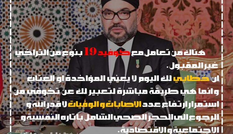 جهويا ووطنيامنوعات الملك محمد السادس : هناك من تعامل مع كوفيد 19 بنوع من التراخي غير المقبول بواسطة safisud.com آخر تحديث أغسطس 20, 2020 0 0 شارك FacebookTwitterGoogle+ReddItWhatsAppPinterestالبريد الإلكتروني