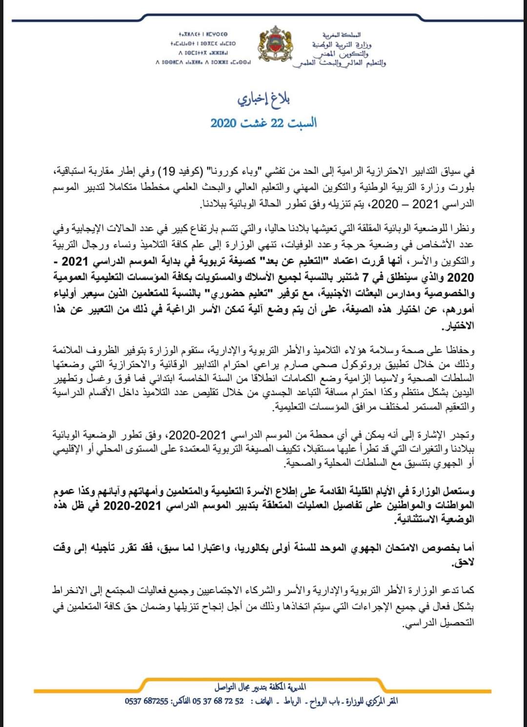 عاجل : وزارة التربية الوطنية تقرر إعتماد التعليم عن بعد لجميع الأسلاك والمستويات بكافة المؤسسات التعليمية في بداية الموسم الدارسي 2021 .