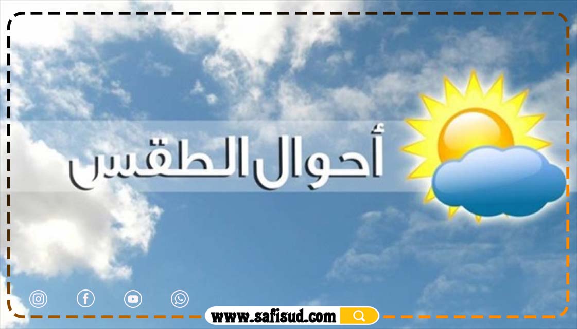 تتوقع المديرية العامة للأرصاد الجوية، بالنسبة ليوم غد الأربعاء، أن تكون الأجواء غائمة مع نزول قطرات متفرقة أو زخات في بعض الأحيان وبعض الأوقات بكل من السواحل والسهول المحيطية شمال الصويرة.