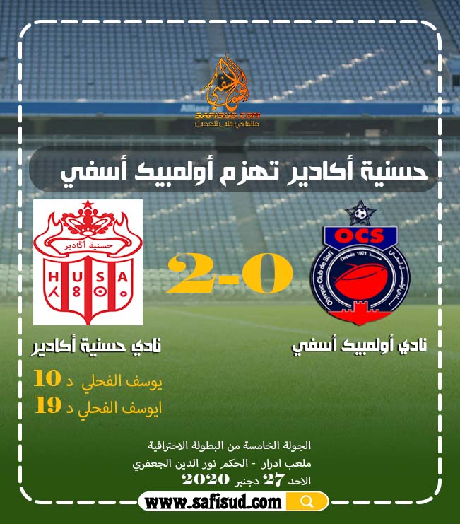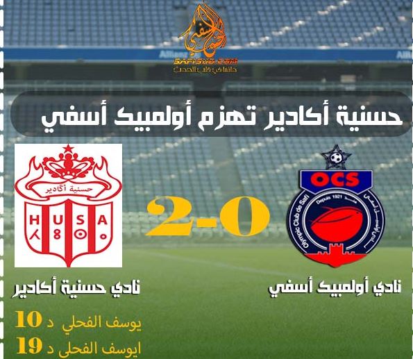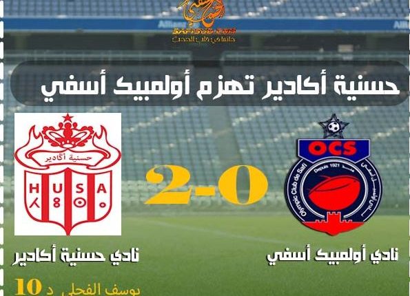 إنهزم فريق اولمبيك أسفي بهذفين نظيفين أمام حسنية أكادير في المباراة التي جمعتهما بملعب أدرار برسم الجولة الخامسة من البطولة الإحترافية .
