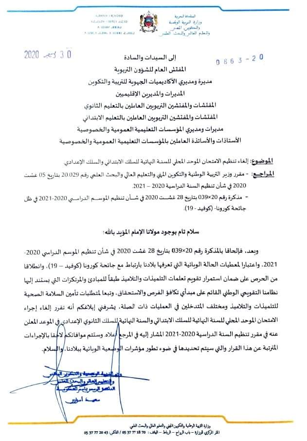 قررت وزارة التربية الوطنية والتكوين المهني والتعليم العالي والبحث العلمي إلغاء تنظيم الامتحان الموحد المحلي للسنة النهائية للسلك الابتدائي والسلك الإعدادي وذلك في ظل الحالة الوبائية المرتبطة بانتشار فيروس كورونا المستجد.