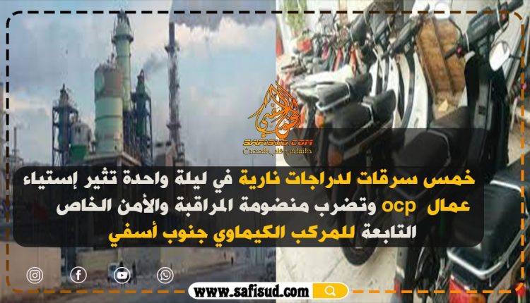 أثار وقوع خمس سرقات لدارجات نارية في ليلة واحدة من أمام المركب الكيماوي جنوب آسفي ، غضب وإستياء العمال ضحايا هذه السرقات وفتح السؤال حول مدى فاعلية وجدوى منظومة المراقبة والأمن الخاص التابع لمؤسسة صناعية بحجم المجمع الشريف للفوسفاط .
