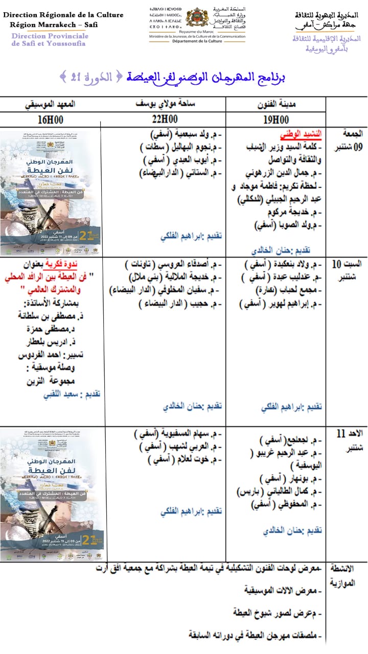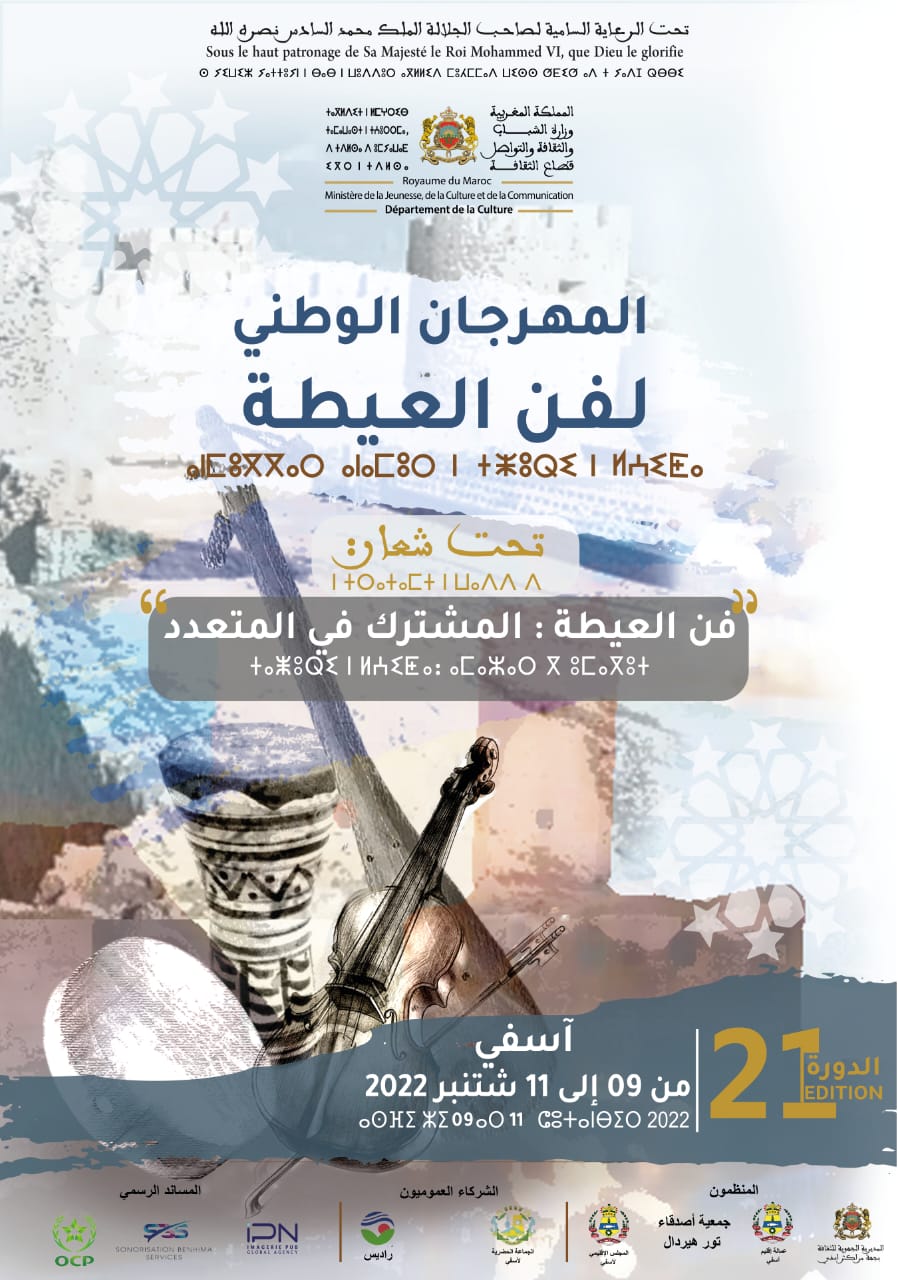 تحت الرعاية السامية لصاحب الجلالة الملك محمد السادس نصره الله، تنظم وزارة الشباب والثقافة والتواصل بشراكة مع عمالة إقليم آسفي وجمعية أصدقاء تور هيردال وبدعم من المجلس الإقليمي والمجلس الجماعي والمكتب الشريف للفوسفاط الدورة 21 للمهرجان الوطني لفن العيطة بمدينة آسفي في الفترة الممتدة ما بين 9 و11 شتنبر 2022.