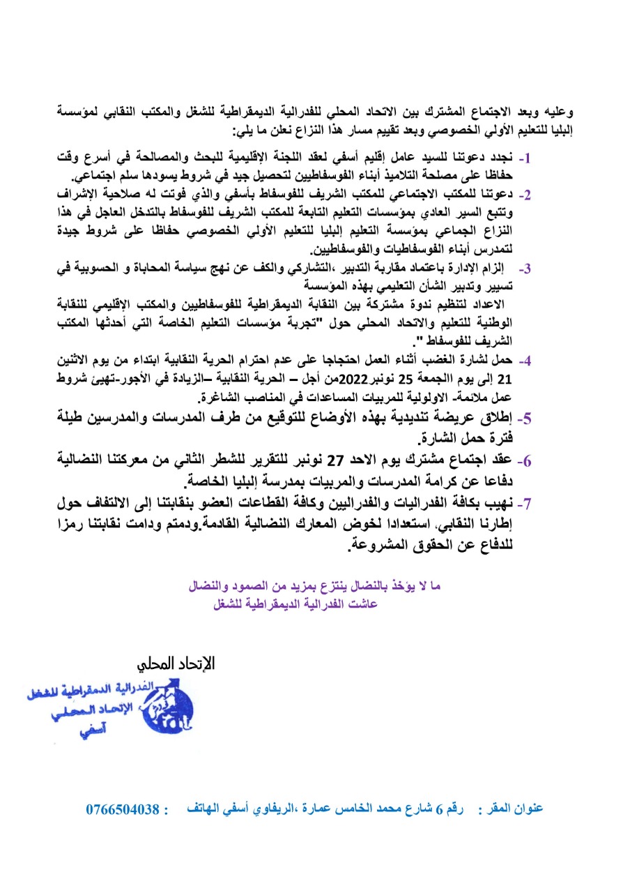 ودعا الإتحاد النقابي بأسفي ، المكتب الاجتماعي للمكتب الشريف للفوسفاط بأسفي والذي فوتت له صلاحية الإشراف وتتبع السير العادي بمؤسسات التعليم التابعة للمكتب الشريف للفوسفاط بالتدخل العاجل في هذا النزاع الجماعي بمؤسسة التعليم إلبليا للتعليم الأولي الخصوصي حفاظا على شروط جيدة لتمدرس أبناء الفوسفاطيات والفوسفاطيين.