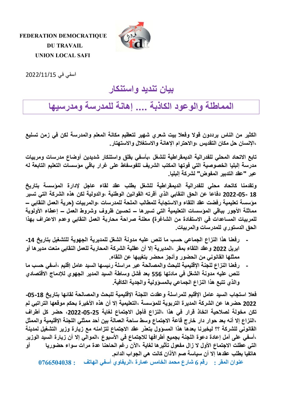 الاتحاد المحلي للفدرالية الديمقراطية للشغل بآسفي يستنكر أوضاع مدرسات ومربيات مدرسة إلبليا الخاصة