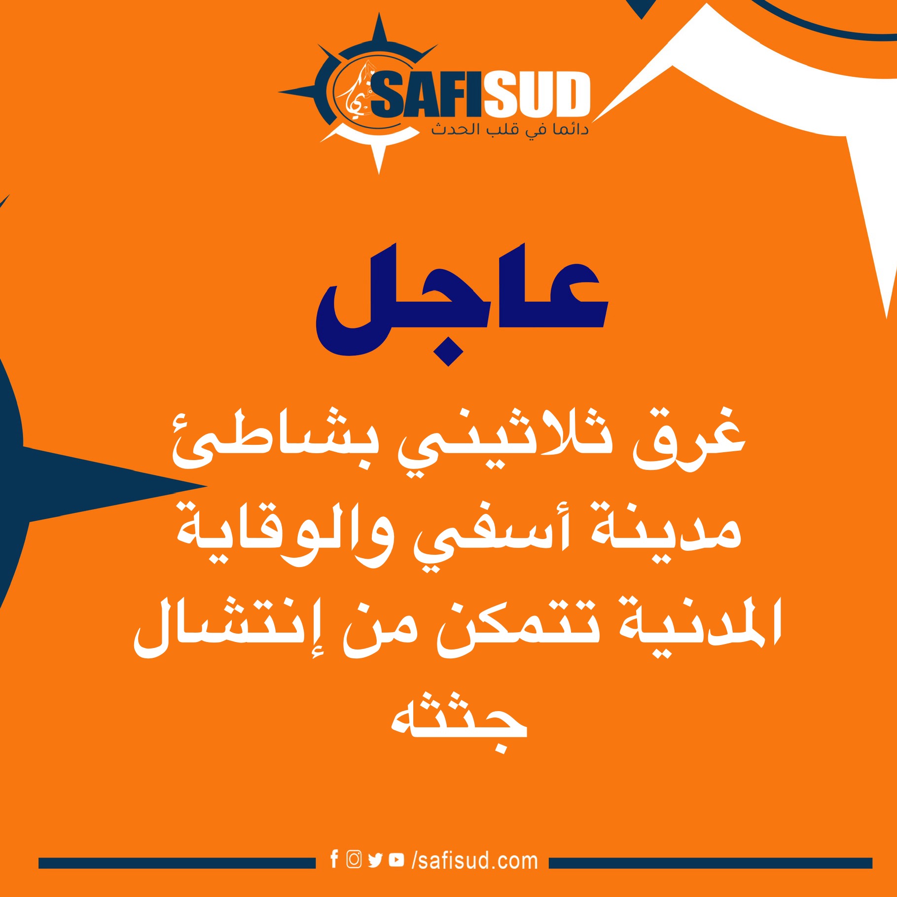 المصدر أفاد أن الهالك ( جمال – د) يبلغ 30 سنة ويقطن بمنطقة خط أركان تم انتشال جثثه من البحر ونقلها إلى مستودع الأموات بأسفي ..