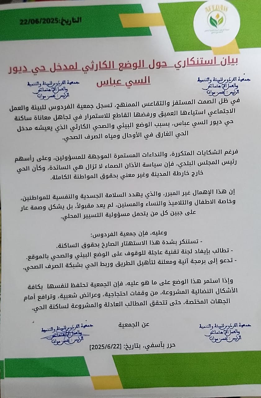وعبرت جمعية الفردوس في بيان لها عن استياء الساكنة ورفضها الإستمرار في تجاهل المعاناة جراء الوضع البيئي والصحي الذي يعيشه مدخل الحي الغارق في الأوحال ومياه الصرف الصحي مما يشكل وصمة عار على مسيري الشأن المحلي .