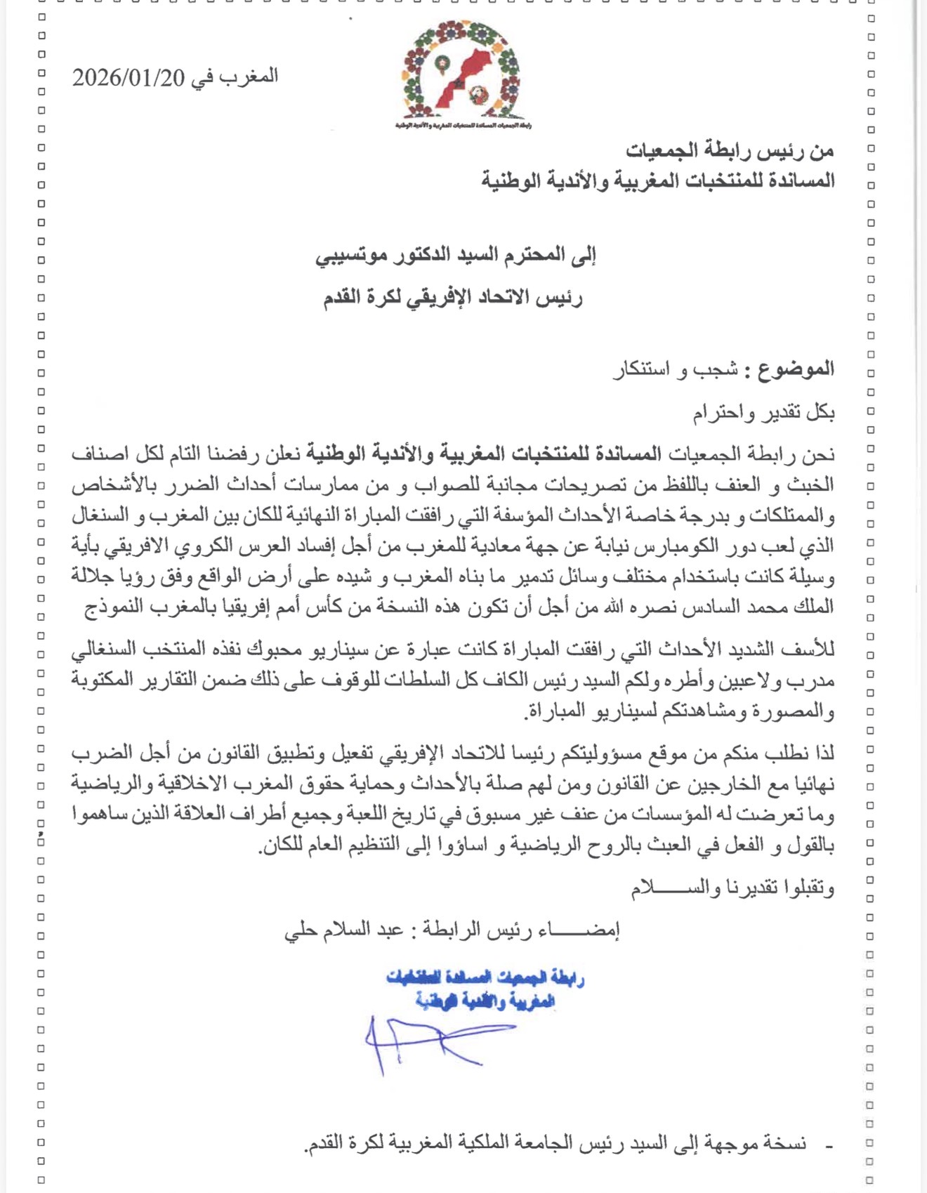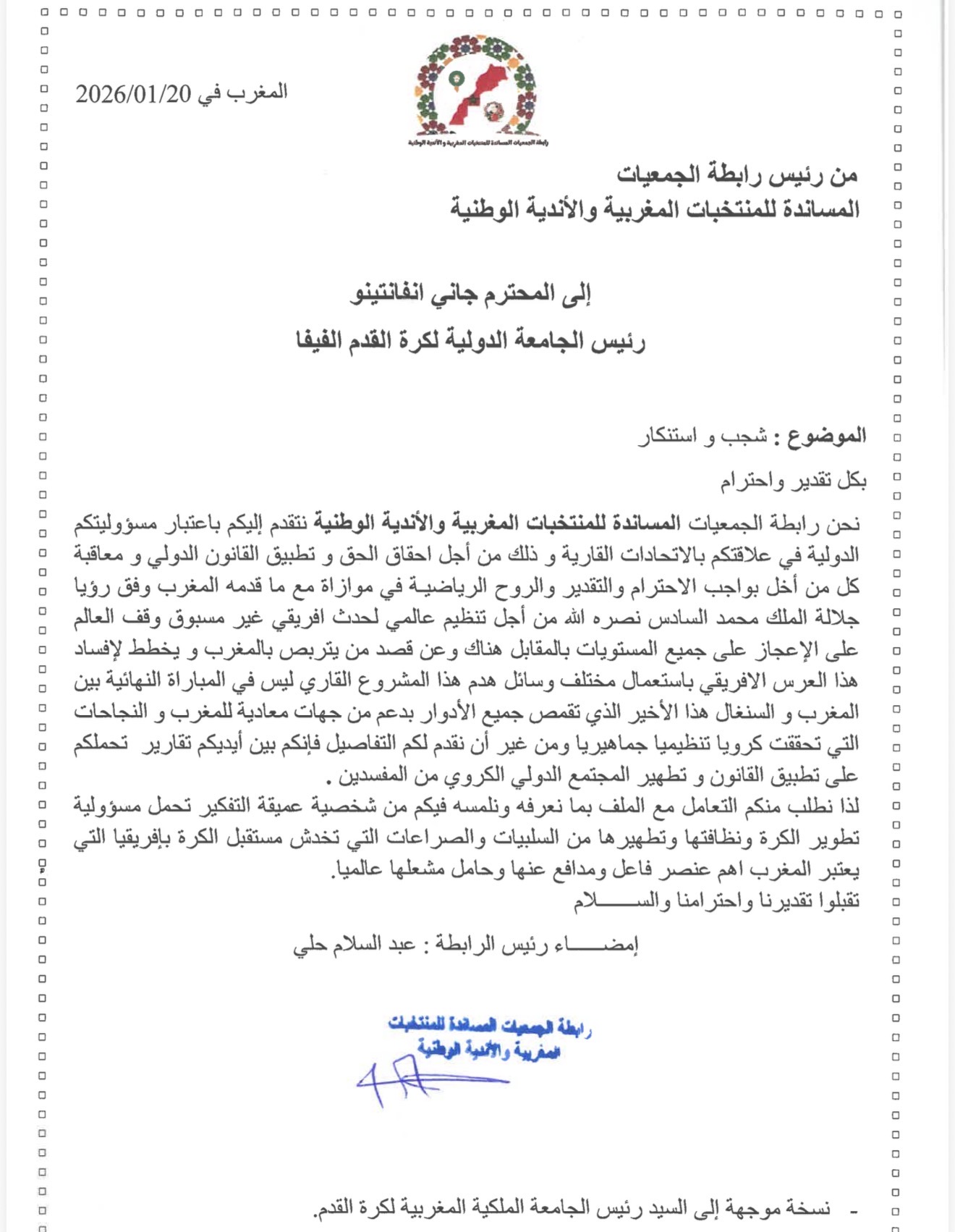 رابطة الجمعيات المساندة للمنتخب المغربي تقدم احتجاجها لدى رئيس الفيفا ورئيس الكاف